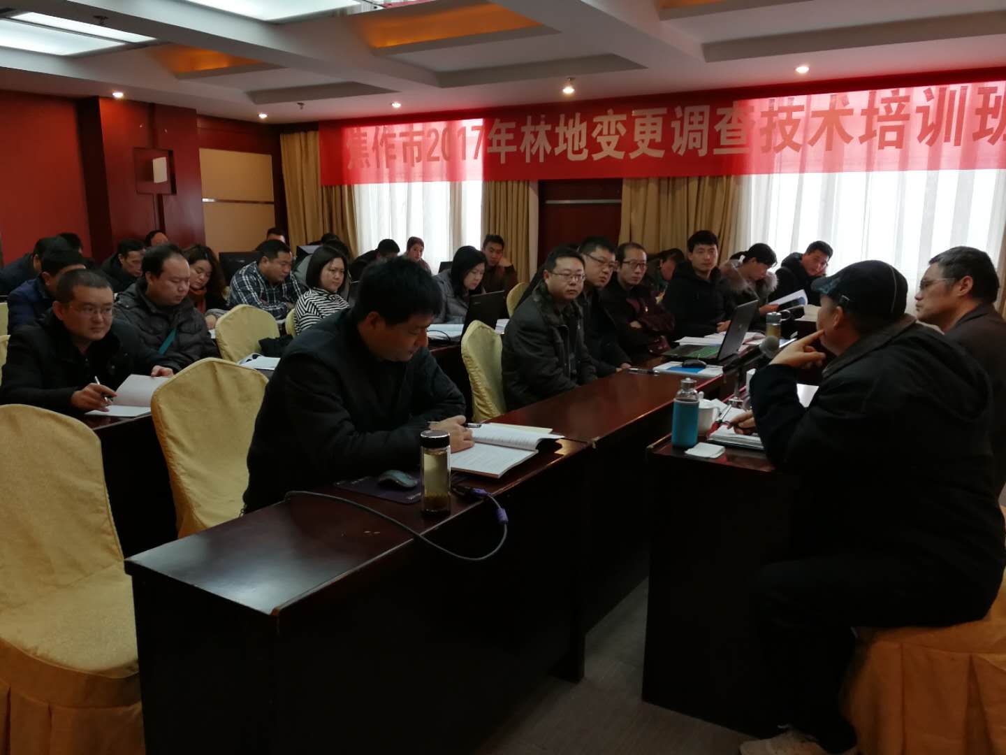 为进一步推进全省林地"一张图"建设、更新与应用,使我市林地变更调查工作顺利开展。根据省厅安排,2018年1月15日至20日,由市林业局组织的焦作市2017年林地变更调查技术培训班在我市云达国际饭店五楼会议室举行。来自全市各县区的40余名资源科长和技术骨干参加了此次培训。