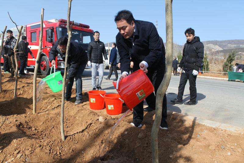 经过近千名党员干部的共同努力,紫薇、白皮松等2000株景观苗木在南山路两侧扎根,形成了一道美丽的风景线。随后,大家有秩序地来到消防车前排队打水,一桶一桶滋养着各自亲手栽植下的树苗。